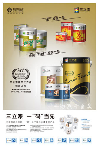 發展,是永遠與創新分不開的。為了探索營銷新路,尋求新的突破,從而最大限度地提升三立漆品牌價值和知名度,三立漆率先攜手二維碼領域的領軍企業銀河傳媒,全面起用二維碼技術,打響了國內涂料行業無線網絡營銷第一槍。