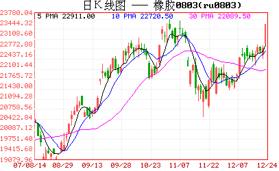 12月24日,滬膠803合約收于漲停價23600元/噸,漲905元或3.99%,因停割與上周五國際原油飆升的鼓勵,滬膠在東京膠休市的情況下,走出獨(dú)立的井噴行情。上周五,國際原油大漲逾2%, 近月2月原油合約結(jié)算價升2.25美元或2.47%,報(bào)每桶93.31美元,受汽油期貨上揚(yáng)支撐,且數(shù)據(jù)顯示11月個人支出強(qiáng)勁,帶動美股勁揚(yáng)。油價上漲再度引發(fā)化工業(yè)品價格的走強(qiáng),同時,國內(nèi)現(xiàn)貨報(bào)價持穩(wěn)于21685元,也對期貨形成了強(qiáng)力支撐;但值得注意的是多頭并不能過于樂觀的庫存數(shù)據(jù),上海期貨交易所上周末庫存再增1125噸至89635噸,不斷高企的庫存令滬膠能否達(dá)到25000這樣的高點(diǎn)存有巨大的疑問。