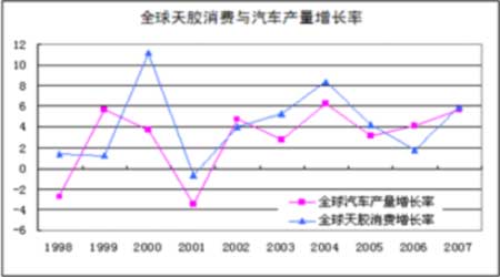 由于輪胎消費占到天膠整個消費的近68%,因此全球汽車業的景氣程度將直接對天膠的消費構成影響。美國汽車業三巨頭2007年汽車產量合計占到全球汽車產量的25%,因此美國汽車業的風險極可能導致全球2009年汽車產量大幅度下滑。由于全球汽車產量與天膠消費增長具有高度的正相關性,且汽車產量增長率的拐點還略微領先于天膠消費增長率的拐點,因此未來兩年隨著全球汽車業逐步陷入景氣循環周期的低谷,全球天膠消費的增長勢必出現明顯回落。