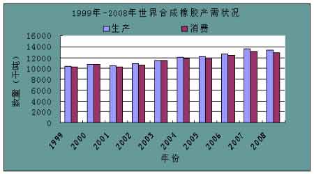 合成橡膠作為原油重要的產品和天然橡膠良好的替代物近年來生產量和需求量均呈不斷增加態勢。根據國際橡膠研究組織(IRSG)公布的數據顯示,近10年來,世界合成橡膠整體上不論從生產還是需求基本上保持供需平衡狀態。每年生產略大于需求。2008年全球合成橡膠產需狀況較2007年有所下滑。全年生產橡膠1333萬噸,較2007年下降了24萬噸;而消費需求為1290萬噸,較2007年下降了18.4萬噸。而2007年合成橡膠庫存量為435萬噸,這樣即使2008年合成橡膠庫存量應該至少為429萬噸左右。而另據IRSG的預測表明,2009年全球橡膠需求量預估下降5%,即111.6萬噸,按照天然橡膠和合成橡膠的比例,合成橡膠需求量減少應在在67萬噸左右。