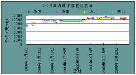 隨著原油價格觸底反彈后,國內合成橡膠價格也開始逐步攀升。這是由于年初對今年經濟預期較差加之實際需求疲軟,各地石化生產廠家均延長了春節長假,即使開工后,仍然維持了較低的開工率。同時由于市場需求清淡,貿易商在節后延遲入市。并且手中較少囤積現貨。而節后原油價格有所反彈,天然橡膠價格受到收儲政策提振開始上揚。這樣合成橡膠價格也隨之水漲船高,節節攀升。09年1-2月份,國內合成橡膠價格總體上漲了4000元左右。從年初的8800上漲到2月份末的12900,上漲幅度達到了46.6%。合成橡膠的價格上漲配合了天然橡膠價格的反彈行情。