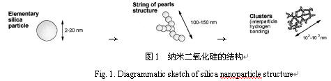 如圖1所示,納米二氧化硅的原生粒子為2-20nm的球形粒子,球形粒子間通過化學鍵聯結成50-500nm的珍珠串結構的支鏈聚集體,此結構的聚集體不能通過剪切等機械力分散,是補強硅橡膠的最基本單元[4],聚集體間又通過氫鍵形成了結構松散的網狀的附聚體。