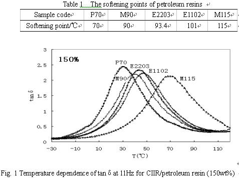本研究主要采用氯化丁基橡膠(CIIR)與石油樹脂共混,并添加其它組份制備綜合性能優(yōu)異的阻尼材料。為了研究石油樹脂對阻尼性能的影響,保持其它組份(ZnO、抗氧化劑、炭黑、硬脂酸)及含量不變。試樣的制備:CIIR、石油樹脂及和其它組份經(jīng)雙輥開煉機(jī)共混后,在150℃、10MPa條件下熱壓10min后冷卻得到厚2mm左右的片材。