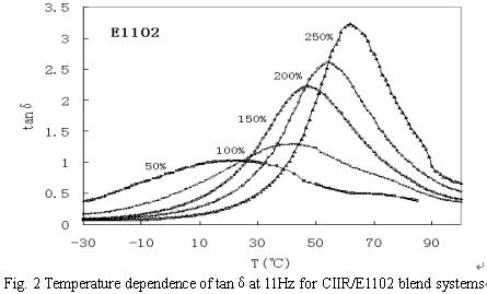 圖1是不同軟化點(diǎn)的5種石油樹脂(見表1)與CIIR共混物的內(nèi)耗(tanδ)曲線。從圖1可以看出,CIIR/石油樹脂共混體系只有一個 tanδ峰,這表明CIIR與石油樹脂是相容的;隨石油樹脂軟化點(diǎn)的提高,CIIR/石油樹脂共混體系的 tanδ峰逐漸向高溫偏移,這為我們設(shè)計不同使用溫度的阻尼材料提供了條件。圖2不同配比的石油樹脂E2203與CIIR共混物的內(nèi)耗(tanδ)曲線。隨著E2203含量的增加,tanδ峰逐漸向高溫偏移,tanδmix也顯著增加,阻尼性能變得越來越好。結(jié)果表明:CIIR/石油樹脂共混體系是一種兼有高阻尼、低成本和粘合性的新型阻尼材料,具有廣闊的應(yīng)用前景。