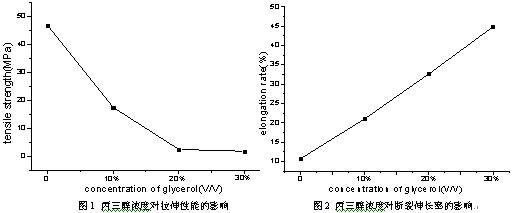 結果表明:通過改變殼聚糖和海藻酸鈉的濃度可調整復合膜的吸收性能,可達到自身重量的10-20倍。殼聚糖和海藻酸鈉是極性高分子材料,發生聚電解質絡合反應形成復合膜,拉伸強度很大,但是斷裂伸長率低,如圖1和圖2所示。通過加入增塑劑丙三醇,稀釋聚合物,減少高分子鏈之間的作用力,降低強度,提高斷裂伸長率。當丙三醇的濃度為10%時,復合膜不僅具有一定的強度,并且具有一定的柔韌性。