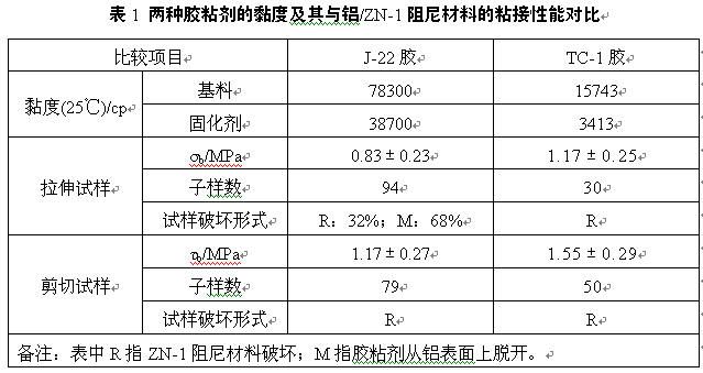 膠粘劑的黏度對粘接效果的影響是相當(dāng)重要的。從微觀角度看,被粘物的表面是凹凸不平的,將這樣的表面迭合起來,只有很小的點(diǎn)能相互接觸,而大部分的表面都不能接觸,為了將被粘物的粗糙表面填平,所用膠粘劑就應(yīng)當(dāng)具有較好的流動性和潤濕性,以對固體表面產(chǎn)生良好的潤濕鋪展。表1中列出了J-22膠與TC-1膠的黏度值及粘接鋁/ZN-1阻尼材料試樣的剪切強(qiáng)度及拉伸強(qiáng)度,制作試樣時鋁的表面采用砂紙打磨處理。