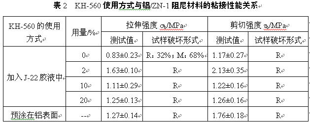 為了改善高黏度的J-22膠在砂紙打磨處理后的鋁表面的附著力,選擇了硅烷偶聯(lián)劑KH560,分別采用在打磨處理后的鋁表面上預(yù)涂KH560及將其以一定比例添加到J-22膠液中兩種方法,研究中對比了這兩種使用方式對鋁與ZN-1阻尼材料的粘接性能的影響,結(jié)果見表2。