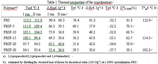 首先,采用熔融縮合聚合法合成了不同丙二醇含量的聚酯,然后用三氯甲烷溶解,甲醇沉淀。得到了白色纖維狀固體,室溫真空干燥。DSC測試的升降溫速率均為10℃/min,兩次循環(huán)測定,結(jié)果如下如表1所示: