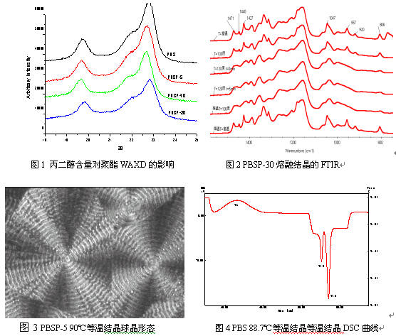 由圖1可以看出,PBSPs系列共聚酯中隨丙二醇鏈段的介入,熔點和結(jié)晶度均有所下降,而且玻璃化溫度也成下降趨勢。第一個循環(huán)的熔點和結(jié)晶度大于第二個循環(huán)。這是因為在溶液沉淀結(jié)晶過程中,聚合物易得到較完善的晶體,熔點和結(jié)晶度較高。無論是溶液沉淀結(jié)晶還是熔融結(jié)晶,在DSC曲線中都觀察到了熔融-重結(jié)晶現(xiàn)象。WAXD表明(圖1),共聚酯的衍射峰不受丙二醇鏈段介入的影響,2θ:19.57、21.74、22.60度。偏光顯微鏡觀察表明,共聚酯熔融自然冷卻到室溫時,隨丙二醇鏈段的介入共聚酯的結(jié)晶速度變快、但球晶尺寸變小。FTIR原位觀察表明(圖2),結(jié)晶吸收峰(1427、1047、806cm-1等)變化明顯。