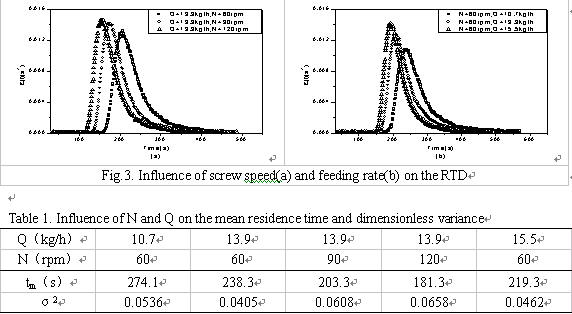采用熒光檢測裝置在線測定了同向TSE(35A)聚苯乙烯體系擠出過程的RTD。實驗通過減少示蹤劑的用量,并提高裝置的靈敏度,使得測定結果盡可能真實地反映了RTD。實驗還研究了螺桿轉速和喂料速率對TSE的RTD的影響。