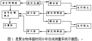聚合物擠出過程停留時間分布(RTD)的在線檢測越來越受到重視,文獻[1][2]報道了基于不同性質示蹤劑的多種RTD的在線檢測方法,以及所采用的不同的檢測裝置。在分析各種RTD在線檢測方法基礎上,作者研制了一種聚合物停留時間分布在線測量裝置,其測量原理為:由參比探測器監視紫外光源發射特定波長的紫外光,采用光纖探頭的一部分光纖從光源輸送入射光線,照射以定量間隔地加入示蹤劑的被加工聚合物,被加工聚合物中的示蹤劑受激發而產生相應特定波長的微光。光纖探頭的另一部分光纖將產生的微光傳輸到微光探測器,由微光探測器接收微光信號,再經放大器及信號處理單元,由計算機采樣,并實時顯示停留時間分布模擬信號隨時間變化曲線圖。