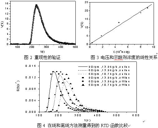 聚合物停留時間分布在線測量系統可靠性的評價包括以下三個方面:重現性、模擬微光信號和示蹤劑濃度的線性關系、不同方法測量得到的RTD函數的一致性。圖2為本裝置在線測量TSE-35型雙螺桿擠出機RTD的電壓-時間曲線(喂料速率10.7kg/h,螺桿轉速60rpm),三組重復性實驗得到的曲線疊加得很好,表明良好的重現性。電壓信號和聚合物中示蹤劑濃度的關系如圖3所示。可見,在實驗的示蹤劑濃度范圍內,兩者可以近似按線性關系處理。圖4顯示了離線取樣分析和在線測量得到的TSE-35型雙螺桿擠出機中的RTD曲線。喂料速率10.7kg/h、13.9kg/h,螺桿轉速60rpm、90rpm,離線分析和在線測量得到的各組RTD曲線一致性良好。