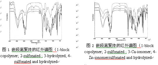 圖1、圖2是樣品經(jīng)磺化、水解及金屬離子交換后的紅外譜圖。可以發(fā)現(xiàn),引入離子基團(tuán)后,分別發(fā)生了對(duì)應(yīng)的特征峰變化?;腔?,1200~1150cm-1之間的吸收峰明顯增強(qiáng),是磺酸基團(tuán)S=O的伸縮振動(dòng)吸收所致,在1010 cm-1處附近出現(xiàn)了代表磺酸基取代苯環(huán)的面內(nèi)彎曲振動(dòng)吸收峰。水解后,代表羰基的1730cm-1中心吸收峰漂移到了1728cm-1中心附近,同時(shí)代表羥基的3500 cm-1附近和2900 cm-1附近的吸收帶得到明顯加強(qiáng)。而1600 cm-1則是金屬離子聚集體內(nèi)部的O-C-O彎曲振動(dòng)的吸收峰[3],而且,鋅型離聚體中金屬鋅聚集比鈣離聚體中鈣的聚集嚴(yán)重,此處的吸收明顯更強(qiáng)。