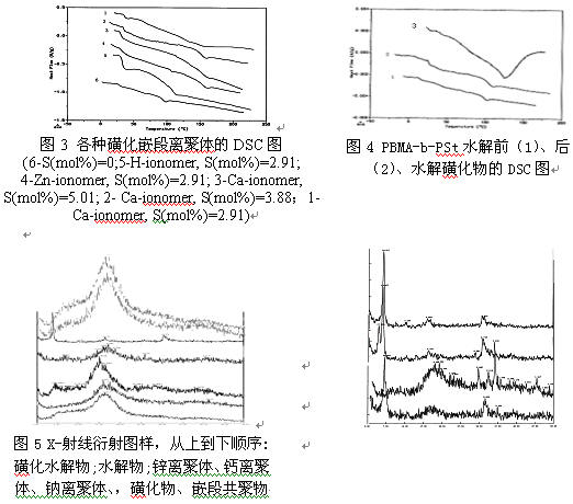 圖3、圖4是各種磺化嵌段離聚體的DSC圖。磺化后,由于磺酸基團(tuán)的作用,代表聚苯乙烯段的玻璃化熱轉(zhuǎn)變溫度向高溫方向漂移。引入金屬離子,由于金屬離子的作用力更強(qiáng),代表聚苯乙烯段的玻璃化熱轉(zhuǎn)變溫度向更高溫度方向漂移。過(guò)渡金屬鋅比相應(yīng)濃度的堿土金屬鈣表現(xiàn)出對(duì)玻璃化溫度影響更大;同時(shí),隨鈣離子濃度的增加,玻璃化溫度向高溫方向移動(dòng)。水解磺化后,兩嵌段的相容性得到改善,玻璃化熱轉(zhuǎn)變區(qū)變得很寬,且有向中間靠的趨勢(shì),即代表聚甲基丙烯酸丁酯段玻璃化熱轉(zhuǎn)變的溫度高漂,而代表聚苯乙烯段玻璃化熱轉(zhuǎn)變的溫度低移。