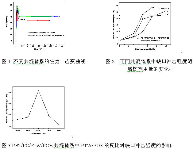 實驗部分: 先將聚碳酸酯(PC,牌號:PC110,旭美化成股份有限公司),聚對苯二甲酸丁二醇酯(PBT,牌號:L2100-G,儀化集團公司工程塑料廠)用真空烘箱在120℃下干燥4小時后,與乙烯-丙烯酸丁酯-甲基丙烯酸縮水甘油酯共聚物(PTW,牌號:ElvaloyPTW,DuPont),乙烯-辛烯共聚物(POE,牌號:Engage8180,DuPont-Dow)一起加入到雙螺桿擠出機中進行混煉,共混溫度為230-250℃,螺桿轉速為250-350rpm,將擠出的粒料用普通烘箱在100℃下干燥4小時后在注塑機上制得標準樣條,注塑溫度為:230-259℃。試樣分別按照ISO R527,ISO 178,ISO 180標準測試拉伸、彎曲、沖擊等性能指標。