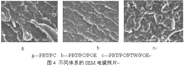 由圖1,圖2和圖3可見,加入PTW和POE后,聚碳酸酯/聚對苯二甲酸丁二醇酯體系的斷裂伸長率,缺口沖擊強度有明顯的提高,而且,將PTW和POE并用,特別是PTW和POE的重量比為50比50,與單獨用PTW或POE相比,韌性有更大的提高。由圖2還可知,隨著增韌劑用量的增加,PBT/PC/PTW/POE共混物發生脆-韌轉變要早于PBT/PC/PTW和 PBT/PC/ POE共混物,說明并用PTW和POE對PBT/PC共混體系的增韌效果好。這是由于PTW由于含有環氧官能團和低的玻璃化轉變溫度,-50℃,是聚酯的優良的增韌劑。POE是一種很好的熱塑性彈性體,并且可以改變聚對苯二甲酸丁二醇酯的結晶形態和共混物的相結構[5],將PTW和POE并用后,不僅可以通過PTW增加PBT、PC兩者的相容性,而且可以通過POE改變共混物的形態結構,從而使聚碳酸酯/聚對苯二甲酸丁二醇酯合金具有更優異的性能。比較圖4中a,b,c可見,加入PTW 后,細化了體系中的POE橡膠粒子,這樣可以提高增韌效果。