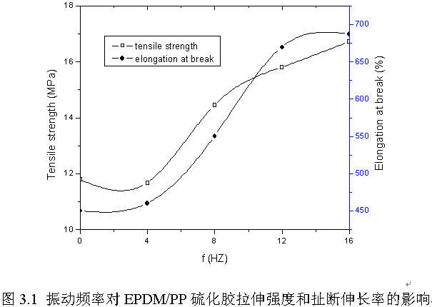 值得注意的是圖3.3,隨著振動頻率的增加,EPDM/PP硫化膠的100%定伸應力先增加后減小,當頻率在12Hz附近時,100%定伸應力達到其最大值。