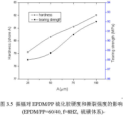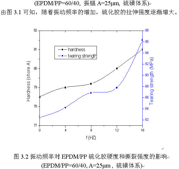 圖3.2可知,隨振頻增加,共混物的邵爾A型硬度、撕裂強度值也有所增加。