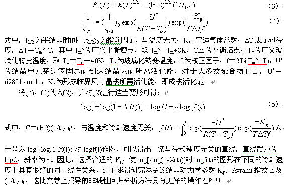 Isayev等[7]在分析聚對苯二甲酸乙二醇酯(PET)的非等溫結晶時,引入Hoffman-Lauritzen形式[8]的速率常數,將Nakamura方程成功推廣到降溫速度為2到40℃·min-1下的結晶過程。
