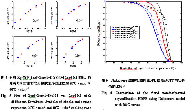 2)通過對HDPE在不同冷卻速度下結晶動力學的模擬值與DSC實驗值的比較,得到了兩種能描述聚合物在變溫熱歷史下的結晶動力學形式,即Dutta法和Nakamura法,發現Nakamura法的模擬值與實驗值具有更好的一致性。在Nakamura模型中,直接從HDPE的等速降溫DSC實驗上獲得了材料的結晶動力學參數,根據log[-log(1-X(t))]對logf(t) 作圖時與冷卻速度的無關性,找出了H-L方程中Kg的最佳值,進而確定了其它的動力學參數。