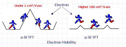 a-Si TFT的電子移動速率低于1 cm2/V.sec,同時驅動IC需要較高的運算速率來驅動電路。這就是為什么a-Si TFT不易將驅動IC集成到基板上。相比之下,p-Si電子的移動速率可以達到100 cm2/V.sec,同時也更容易將驅動IC集成到基板上。結果是,首先由于將驅動IC、PCB和聯結器集成到基板上而降低了生產成本,其次使產品重量更輕、厚度更薄。