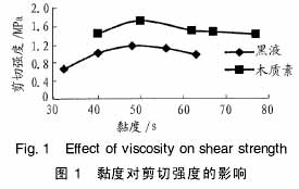 對合成的膠粘劑用涂4杯分別測黏度,并測出黏度對剪切強度的影響,見圖1。