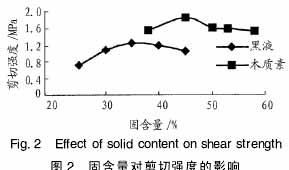 固含量對膠粘劑剪切強度的影響如圖2所示。當采用黑液為原料的膠粘劑在固含量37%~40%時,膠粘劑的剪切強度最大,為1.12~1.18MPa;采用酸析后的木質素為原料的膠粘劑在固含量45%~50%時,膠粘劑的剪切強度最大,為1.52~1.74MPa,另外酸析后的木質素所制得的膠粘劑剪切強度大于采用黑液為原料的,其原因可能是酸析后的木質素的雜質如半纖維素、多糖等相對于黑液要少。