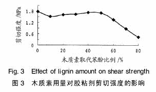 用木質素取代不同量的苯酚,考查不同的取代量與膠粘劑性能之間的關系,測試結果見圖3。