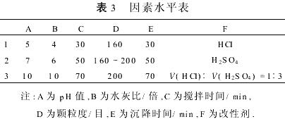 在單因素條件實驗[9]的基礎上可知,影響粉煤灰處理造紙效果的因素有改性劑的選擇、水灰比、PH值、攪拌時間、粉煤灰的顆粒度和沉降時間等。根據單因素條件實驗的結果,選定三水平六因素,如表3所示。