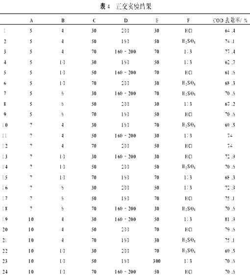 影響粉煤灰處理造紙廢水效果的實驗條件有很多,本文用正交實驗的方法對以改性粉煤灰處理造紙廢水的實驗條件進行優化選擇,研究改性粉煤灰處理造紙廢水的一般規律。