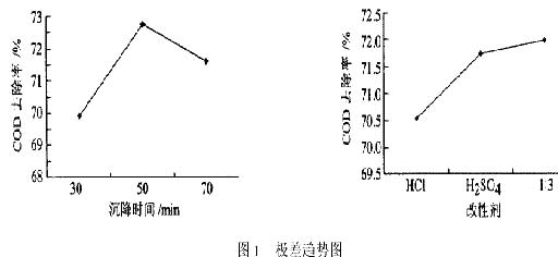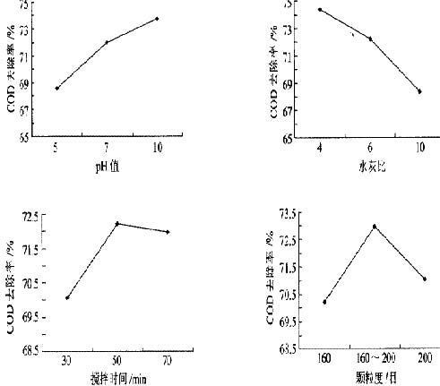由圖1可見,改性粉煤灰處理造紙廢水的優化實驗條件為:選擇V(HCl)∶V(H2SO4)=1∶3的混合液為改性劑,PH=10,水灰比為4:1,攪拌時間為50min,粉煤灰的顆粒度為160~200目,沉降時間為50min。