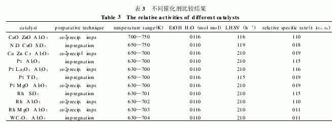 其中 k 為表觀反應(yīng)速率( h - 1); x 為乙醇的轉(zhuǎn)化率;LH SV 為液態(tài)乙醇的比空速(h- 1)。以此公式計(jì)算得出各催化劑對 Cu Zn A l2O3 催化劑的相對表觀速率(如表 3 所示), 并由此得出結(jié)論: 貴金屬催化劑表現(xiàn)出與 Cu Zn 催化劑相似或更差的催化性能, 而R h M gO A l2O 3和W CxO y A l2O 3 活性很差的原因是催化劑的燒結(jié)或W 物種被還原造成的。