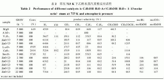 最近L lorca 等[6 研究了乙醇在一系列金屬氧化物催化劑上的水蒸汽重整反應(yīng) (如表 2), 發(fā)現(xiàn)ZnO 具有很好的活性和較高的選擇性, 產(chǎn)物中 CO含量極低, 特別適用于燃料電池。通過提高進(jìn)樣空速和反應(yīng)溫度, 獲得了很高的產(chǎn)氫速率。ZnO 具有較好催化性能, 作者認(rèn)為是由于 ZnO 既有堿性又有氧化還原性質(zhì)的雙重特性造成的。