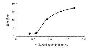 如圖 2 所示 , 隨著甲基丙烯酸用量的增加 , 乳液的穩(wěn)定性有所下降 , 凝塊量增加。當(dāng)甲基丙烯酸用量超過(guò) 0 . 6% 以后 , 乳液中的凝塊量急劇增加 , 穩(wěn)定性迅速下降。可能是由于其水溶性大 , 易在水中自聚或者是加入量過(guò)大 , 超出了體系的 pH 值緩沖能力 ,pH 值降低 , 影響了體系的乳化效果而導(dǎo)致乳液穩(wěn)定性下降。