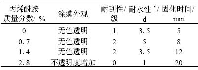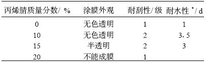 丙烯腈既是一種硬單體 , 又是一種功能性單體。在苯丙乳液中引入適量的丙烯腈單體參與共聚 , 能有效提高乳液的穩(wěn)定性和耐水性 , 增加其對(duì)底材的附著力。但引入過(guò)多的丙烯腈 , 會(huì)造成涂膜硬度增大 , 不透明性增加 , 成膜性下降 , 耐水性變差 , 如表 2 所示。實(shí)驗(yàn)中將丙烯腈的加入量確定為單體總量的 10 % ~ 15 % 。