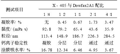 乳化劑對乳液的穩定性和粒徑大小有很大的影響。合成乳液的乳化劑通常為非離子型乳化劑和陰離子型乳化劑的復配物 , 這是因為單獨采用非離子型乳化劑 , 乳液對電解質的化學穩定性良好 , 但會使聚合速度減慢 , 且因為乳化能力弱 , 聚合中易生成凝塊 ; 單獨采用陰離子型乳化劑 , 乳液粒徑小、黏度大、聚合穩定性好 , 但在電解質中的化學穩定性差。將兩者復配使用 , 可以產生協同效果 , 并且用量減少。實驗中非離子乳化劑 (X -405) 和陰離子乳化劑 (Dowfax 2A ) 的配比 ( 總量為 3 % , 質量分數 ) 對乳液性能影響如表 5 所示。