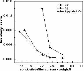 圖 2 為銅粉(平均粒徑 10 μ m ),片狀銀粉粒徑為 (0.1 - 10 μ m) ,和自制的鍍銀銅粉 ( 平均粒徑 10 μ m) ,與所選環氧樹脂和適當比例的固化劑混合所制導電試樣電阻率與導電填料重量百分比的關系曲線。銀粉導電試樣當銀粉含量為 63 %時,電阻率即可達到 10 - 3 Ω .cm 數量級,當銀粉含量為 75 %時,電阻率即可降到 4 × 10 - 4 Ω .cm ;而銅粉導電試樣當銅粉含量達到 75 %,體積電阻率方可降到 10 - 3 Ω .cm ,當銅粉含量達到 80 %,電阻率亦很難降到 10 - 4 Ω .cm ;本實驗室自制的鍍銀銅粉顯示了良好的導電性,當所鍍銀含量為 23 %時,其導電性與銀粉導電膠基本一致,含 75 %的鍍銀銅粉導電試樣電阻率為 5 × 10 - 4 Ω .cm 。導電顆粒互相接觸形成導電通道網絡,是導電復合材料導電的前提 [6] , 銀在空氣中的穩定性及 Ag 2 O 的高導電率,決定了較少銀含量就可形成導電網絡;銅粉在空氣中很容易被氧化,粒徑愈小氧化愈快,而且固化過程也會帶來部分銅粉表面氧化,因此相同比例的銅粉導電試樣電阻率較高。鍍銀銅粉中銀顆粒均勻的包覆在銅表面,當形成導電通路時,基本以銀形成導電通道網絡 , 因此鍍銀銅粉表現出良好的導電性。