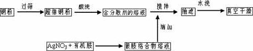 經過反復實驗,選擇分散劑和絡合劑的品種及濃度得到一種不含氰化物的化學鍍銀工藝, 采用此法制備的鍍銀銅粉,導電率高 ,銀的反應率可達 90 %以上。因此 通過調整銀胺絡合溶液中銀相對于銅粉的比例,即可得到所需含銀量的鍍銀銅粉。該方法的工藝流程示意圖如下: