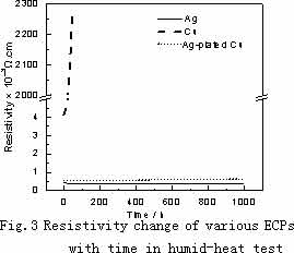 表 1 和圖 3 為銅粉、片狀銀粉及鍍銀銅粉導電試樣在 60 ℃ 相對濕度 100 %條件下進行濕熱實驗時電阻率隨時間的變化。銅粉導電試樣 24 小時電阻升高近 5 倍,三天已完全不導電,銀粉導電試樣在 24 小時內電阻有所下降,然后基本保持不變。鍍銀銅粉中銀起到導電通路的作用,因此可達到基本與銀相同的導電穩定性。
