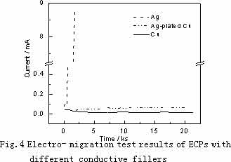 表 2 和圖 4 是直流偏壓為 5V 時,不同導電試樣電遷移試驗時電流隨 時間的變化曲線,銀導電試樣在約 200 秒時電流開始快速增大 , 約 700 秒內已增至 mA 級電流,在濾紙條上可清晰的觀察到黑色的枝狀沉淀物 , 兩電極已經連通 , 表明已經短路 ; 而銅導電試樣電極經 20000 秒的試驗 , 電流穩定在 15-30 μ A 之間 , 并未短路,濾紙上可見一條藍色細線 , 表明銅也發生溶解 , 形成銅離子 , 但未形成枝晶狀沉淀 ; 鍍銀銅粉導電試樣電極同樣經 20000 秒試驗 , 電流穩定 , 沒有短路,在濾紙上可見一條藍色細線 , 在陰極附近有少量褐色物質。