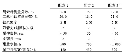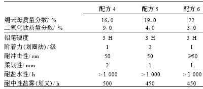 試驗結果見表 1, 在表 1 中調整絹云母和二氧化鈦的添加量 , 分別進行了不同添加比例試驗 , 試驗結果表明 , 增加絹云母用量 , 降低二氧化鈦用量 , 對涂膜的化學性能沒有不良影響 , 在物理性能上其硬度、附著力、柔韌性、耐沖擊性有一定程度的提高 ( 見配方 6 和配方 1) 。而減少了鈦白粉的用量 , 則使涂料成本大大降低。