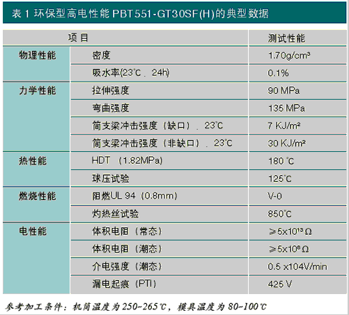 表1是北京市化工研究院開發(fā)出的用于電子溫控器的高電性能熱塑性PBT 551-GT30SF(H)產(chǎn)品的數(shù)據(jù)表,該產(chǎn)品屬含鹵素的阻燃體系(滿足歐盟RoHS要求),具有優(yōu)異的電性能(CTI達(dá)到425V)、良好的加工成型性,綜合性能優(yōu)良,可用于各類電子電器產(chǎn)品的生產(chǎn)。