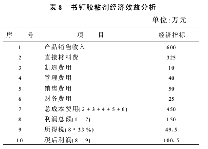 我們以一個小規(guī)模的膠粘劑生產(chǎn)廠為例來分析書釘膠粘劑的經(jīng)濟效益。以年產(chǎn)書釘膠粘劑500t進行計算,目前該膠粘劑的市場價格為12000元/t,膠粘劑的直接材料成本為6500元/t,我們以上述數(shù)據(jù)為基準(zhǔn)進行產(chǎn)品經(jīng)濟效益分析,結(jié)果見表3。