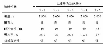 由表 2 知 , 丙烯酸和油酸作為功能單體制得的乳液有較好的涂膜性能。甲基丙烯酸、馬來酸酐為功能單體的乳液涂膜性能較差。這可能是由于后兩者結(jié)構(gòu)中有較大基團產(chǎn)生位阻效應(yīng)。