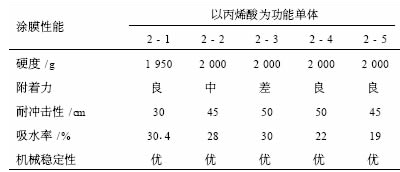 表 2 為各種功能單體對乳液及涂膜性能的影響。