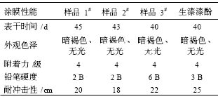 分別取桐油與鄰苯二酚按 1 ∶ 1 、 1 ∶ 2 、 1 ∶ 3 物質(zhì)的量之比反應(yīng)得到鄰苯二酚 - 桐油樹脂樣品 1 # 、 2 # 、 3 # 以及生漆漆酚 , 不添加任何催干劑直接涂布于三合板上 , 考察鄰苯二酚 - 桐油樹脂和生漆漆酚在常溫條件下固化干燥成膜的性能 , 實驗結(jié)果如表 1 。由表 1 可知 , 鄰苯二酚 - 桐油樹脂與生漆漆酚一樣需要較長時間才能干燥成膜 , 涂膜的附著力、硬度、耐沖擊力等性能較差 , 這表明鄰苯二酚 - 桐油樹脂在通常條件下難于自行固化干燥成膜。