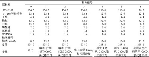 以長效環氧防腐涂料作為基本對照配方 , 以納米 CaCO 3 填料取代原配方中的云母 , 同時試驗了不同品種的納米 CaCO 3 填料對涂料防銹性能的影響。在實驗前已就納米 CaCO 3 填料的用量進行了試驗研究 , 發現當用量過大時 , 引起涂料黏度增大 , 過于稠 , 實干速度慢 , 涂層的物理機械性能降低 , 當選用與原云母用量相同的納米 CaCO 3 時 , 基本不影響涂層的物理機械性能。配方及性能如表 1 和表 2 所示。從表 1 和表 2 可見 :