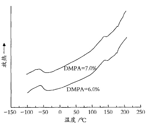 從圖 2 可以看出 ,DMPA 用量對樣品的玻璃化轉(zhuǎn)