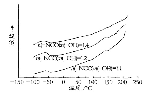 圖 3 為不同 n ( — NCO) ∶ n ( — OH) 比值的水性聚氨酯樣品 DSC 譜圖。