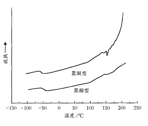 從圖 4 可知 , 聚醚型聚氨酯和聚酯型聚氨酯都存在一定程度的微相分離 , 但是聚醚型的微相分離明顯大于聚酯型。聚醚型的軟段 T g 出現(xiàn)在 - 57 ℃ , T m 大約為 152 ℃ 。聚酯型軟段 T g 為 - 49 ℃ , T m 大約為 150 ℃ 。這一結(jié)果表明聚酯型水性聚氨酯的軟硬段相容性較好 , 聚醚型水性聚氨酯軟、硬段之間的相容性較差 , 微相分離程度相對較大。這是由于聚酯羰基與 N — H 基團(tuán)形成氫鍵的能力強(qiáng)于聚醚分子中的醚鍵與 N — H 基團(tuán)形成氫鍵的能力。另外 , 由于聚醚型軟段含有大量的 C — O — C 鍵 , 鏈段的柔性較高 , 使軟段不能緊密聚集 , 有利于鏈段的相對運(yùn)動 [ 8, 9 ] , 從而使得聚醚型聚氨酯的軟段 T g 較低 , 相分離程度相對較大。同時 , 由于聚酯型聚氨酯的相分離程度較小 , 軟段和硬段的混合程度較高 , 硬段相對受軟段影響較大 , 所以導(dǎo)致聚酯型聚氨酯的熔點(diǎn)與聚醚型的熔點(diǎn)接近。